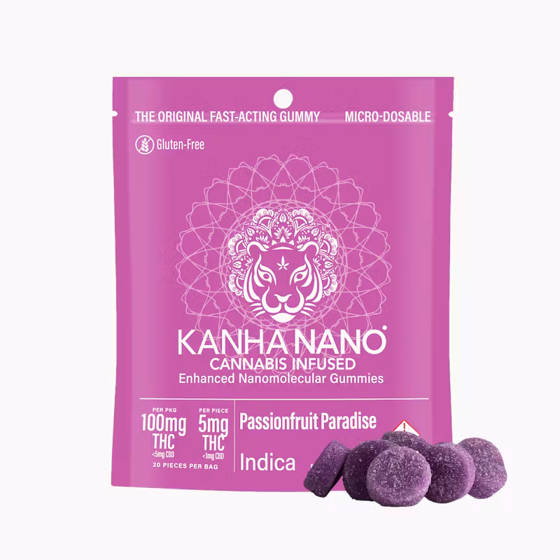 An exotic South American gem, passion fruit tastes like a refreshing wave of tropical goodness. Pairing the tangy citrus flavor with premium indica oil and terpenes like myrcene and α-humulene, Passionfruit Paradise Indica offers better absorption and faster onset times thanks to our exclusive NANO technology. Sold in packages of 20, each gummy contains 5mg of THC, an ideal amount for microdosing or customizing your experience. KANHA, the first to introduce fast-acting effects, remains the industry leader with NANO gummies.